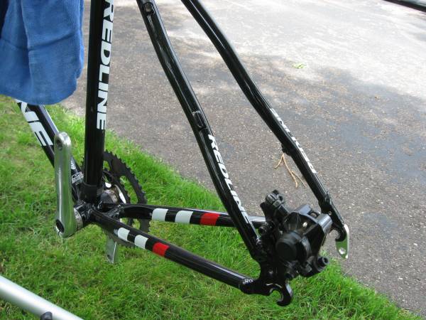 Redline Conquest disc frameset, 54cm, includes frame, fork, headset, stem, crankset, bottom bracket and disc calipers. needs disc wheelset and group. email or text show contact info