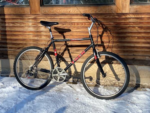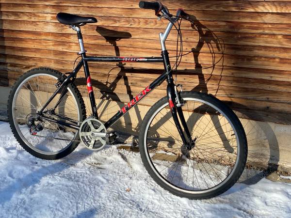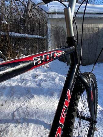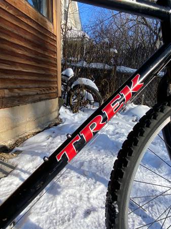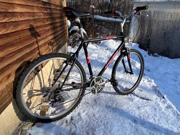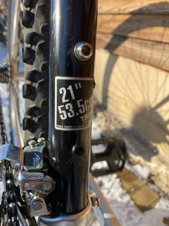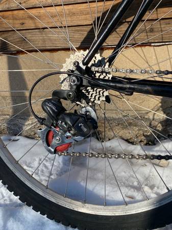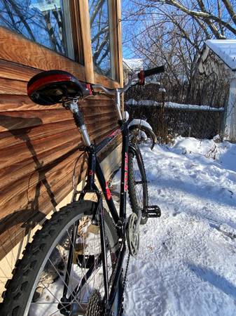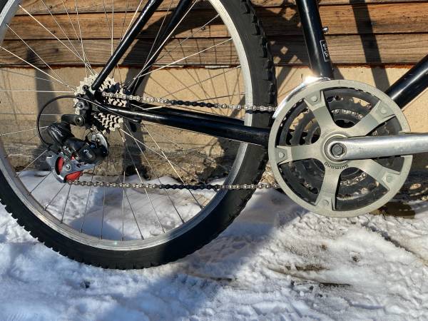 Fully overhauled, rebuilt from the frame up. New cables for brakes and shifters, new brake pads, BB freshly greased, HS also cleaned & greased. Lightweight alloy wheels roll smooth and true. Knobby rubber tires are enough to get you out of most situations you'll encounter on your daily winter rides. Chain/cassette/crank all are in good shape, with chain measuring in spec, and teeth on cogs in good, non-worn condition. Twist shifters are easy to operate with mittens. V-brakes grab nice and tight, shifting is crisp, bike rolls very smooth, and has a planted, sure-footed feel to it. Rider position has you in a stable, upright position that is good for being bounced around by snow and ice and still allows for maintaining control and balance. Frame has some scratches and paint isn't perfect by any means, but no rust, dents or any issues that compromise its integrity to do its job.