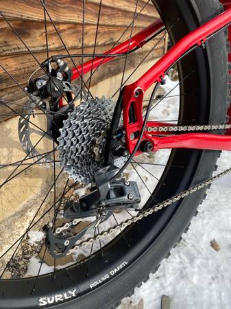 26" x 4" tires are CHUNKY and will ride through anything, full 10x2 SRAM drivetrain shifts crisp, the gold standard Avid BB7 mech disc calipers. Aluminum frame, full rack of braze on mounts on the fork and frame for any adventure bike aspirations you may also have. Would make a great adventure touring rig with a 29" summer wheelset in addition to being a very capable fat bike as is.