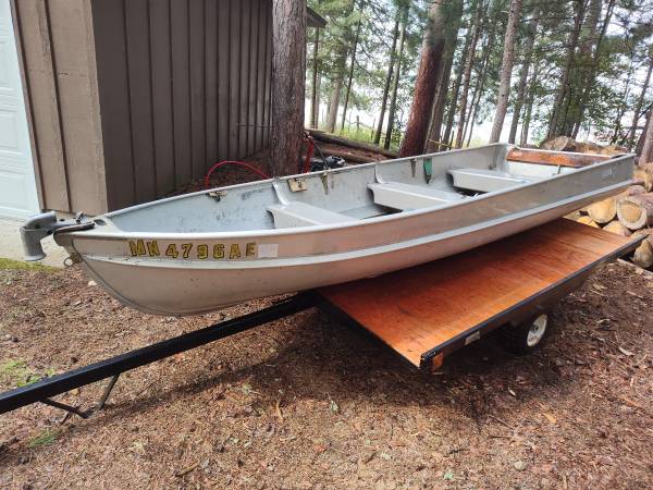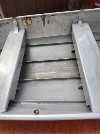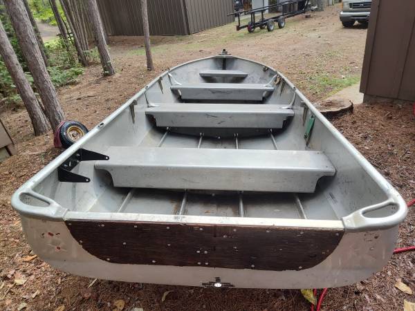 14 ft. AlumaCraft Fishing Boat, Model F, maximum 20 HP Outboard Motor, beam 54 inches, transom 15 inches, 4 bench seats, 2 sets of oarlocks, drain, anchor cradle, first come first served, sold as...