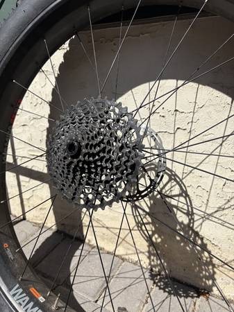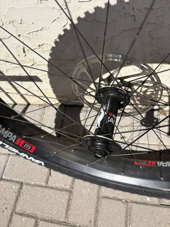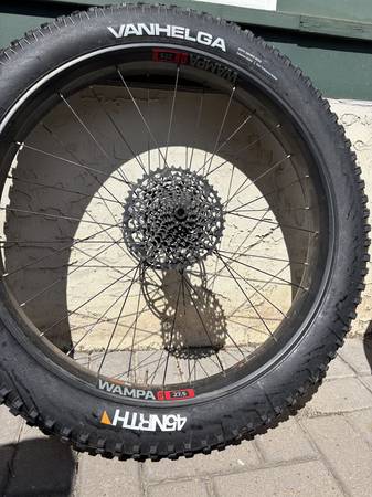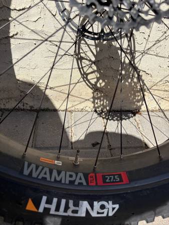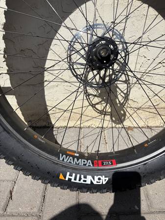 Bontrager Wampa 27.5 with Jackalope hubs, cassette and disk brakes. Came off a 2019 Trek Farley 9.8 and are in near new condition. Being sold as a pair only. Yes, Wampa is a Carbon rim. Only ridden on a few times in snow. I am selling the rims, hubs cassette and disk brakes. The tires are a throw in.