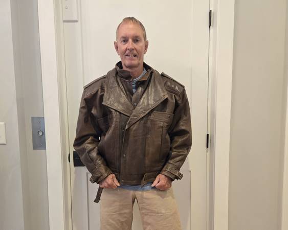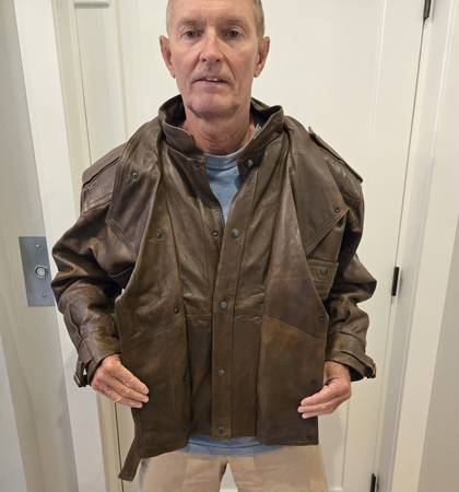 This full leather jacket features a double lapel that snaps and zips, and a high collar. It is well insulated, and extremely warm. Belts that you can use or not, around the waist and each wrist. An attractive look that you will not see like it in this part of the world.