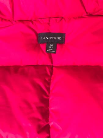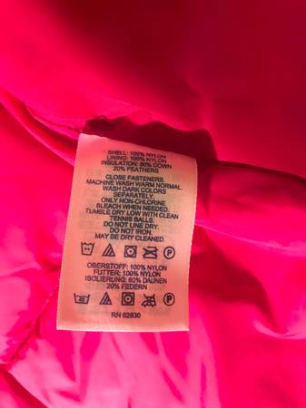 The last photo most accurately represents the color. It's more dark pink not neon pink. Land's End calls it Magenta Berry.