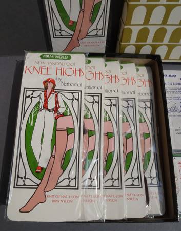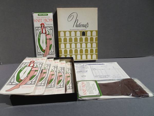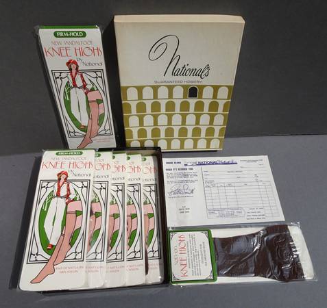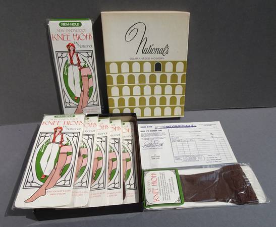 Vintage Nationals Guaranteed Hosiery Nylons, Seven Pairs Sandalfoot KneeHighs, classic Coffee Bean color The boxed set of 6 includes a bonus pair for a total of 7 Nylon packs. One size. Original box...