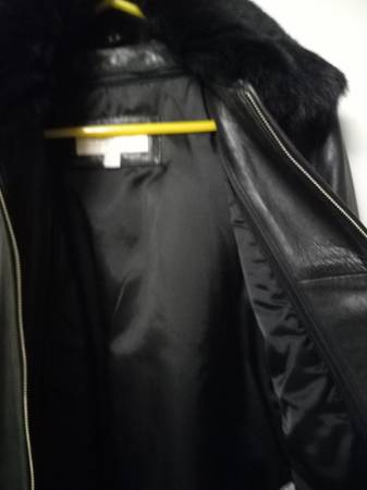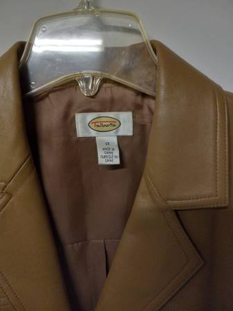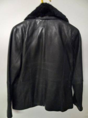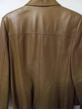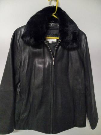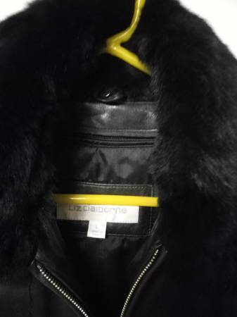 Liz Claiborne Black Leather Jacket. Size L. Detachable Rabbit Fur Collar. Zip-out Lining. $75. Talbots Tan Leather Blazer Size 12. $75. Both in Great Condition. $75 Each.