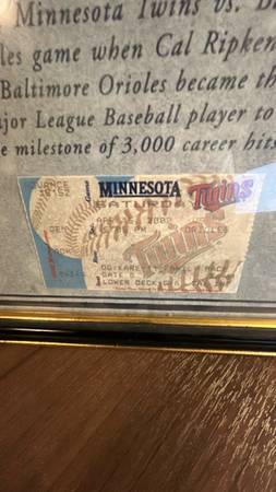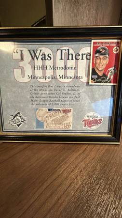 Cal Ripken Jr 3000th hit memorabilia. He got his hit at Metrodome on April 15th 2000. This unique piece of memorabilia commemorates the day. Ticket stub and certificate in a frame. Send text or...