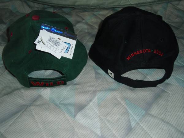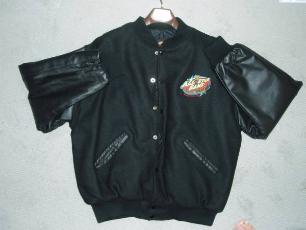 All black official NHL 'letterman' style jacket with snaps down the front, elastic waist and cuffs, wool shell, quilted nylon lining, three pockets - one inside, and all leather sleeves and pocket trim. BRAND NEW, NEVER WORN from the Minnesota, 2004 NHL All Star Game. Has beautifully embroidered logo patch in MN Wild colors on chest that says 'ALL STAR GAME Minnesota 2004'. Size XXL, I'm a size XL and it fits me. 2 caps; one in MN Wild team colors and one matching the jacket, both with adjustable size - never worn. All for only $195.