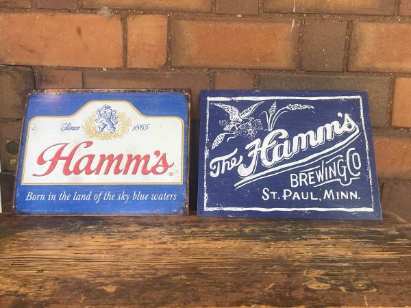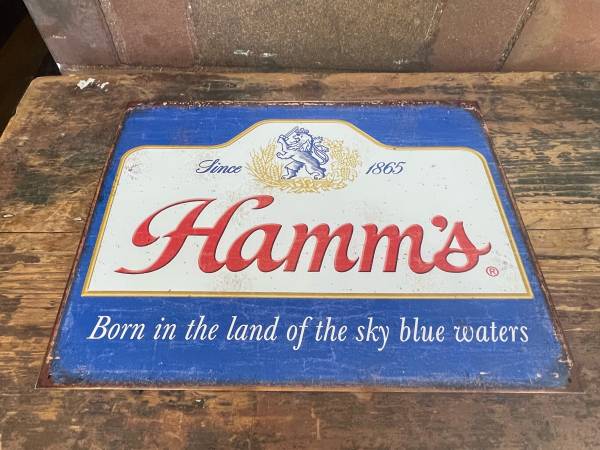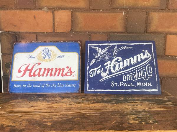 These are 2 different styles 12 1/2 x 16 Hamms beer tin signs. They are not old but have a wonderful rustic old vintage style to them. Excellent condition. Price is only $14 EACH. PERFECT GIFT!!! Will look gr8 in your bar pub cabin restaurant garage art.