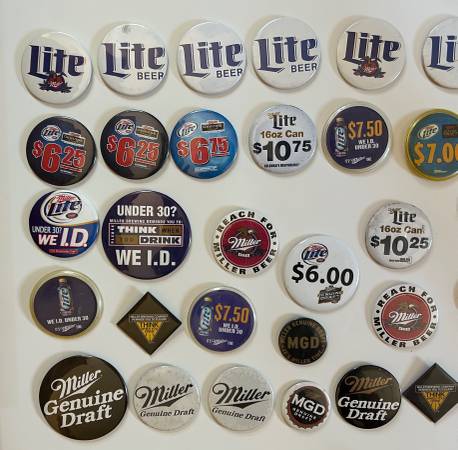 I was a beer Vendor at the Metrodome from 1982 to 2009. This is a collection of buttons I wore over the years as I made my way up and down the aisles selling beer. 38 Miller buttons ..great variety obviously some with prices The only way to acquire these would be working at the Stadium as a vendor not available to the general public. All in decent condition . Last two buttons were last Season of the Stadium buttons