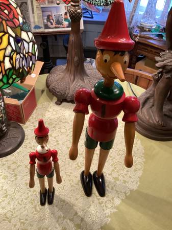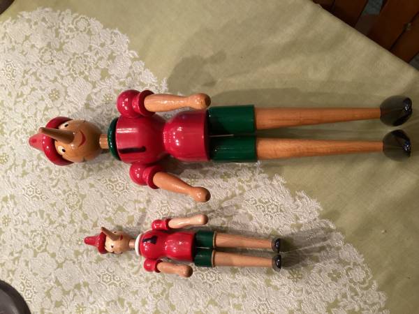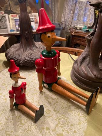 2 VINTAGE ITALIAN, GALETTI PINOCCHIOS FROM MY TRAVELS TO MILAN IN EXCELLENT CONDITION, NO ISSUES SIZES,, 22” TALL AND 12” TALL CALL OR TEXT. . AS PICTURED