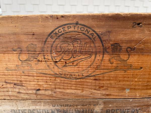 Independent Milwaukee Brewery beer box crate for "BILL'S Exceptional Quality BEER. It has double sided writing and the numbers 12 & 24 on each side of the logos. Pre Prohibition?? It measures 19" long, 12" wide, 8" high. There is a partial wood slat missing from the bottom. Price is $45.