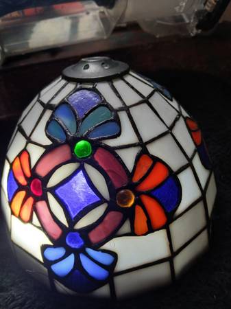 Lovely Stained Glass Lamp Shade (Lamp base not included) illuminates beautifully. 8" in diameter. Cross motif design in vivid colors with a white background. Great for a night stand or end table. There is one piece that has broken, see photos.