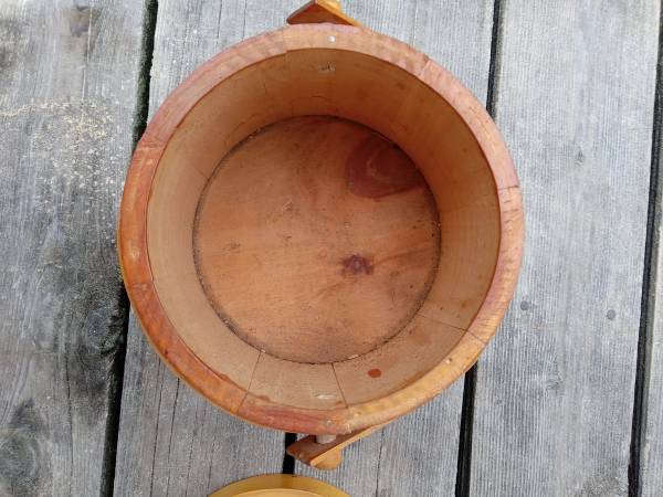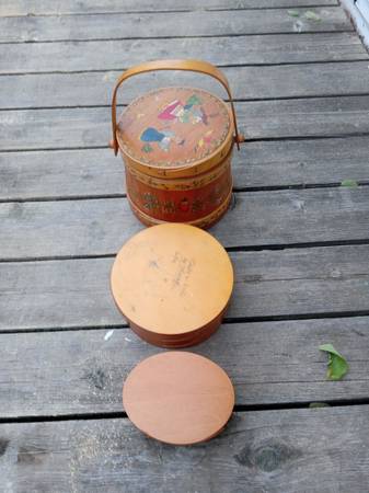 Hand painted covered kitchen butter cask, sugar bucket. along with 2 wood shaker boxes. All in great shape
