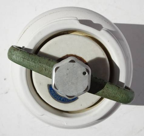 The cast iron yolk is green and the screw knob is a silver metal hexagon. When unscrewed, the yolk arms rotate to the notches in the rim of the crock and the lid lifts off. There is a black rubber gasket to ensure a tight fit.