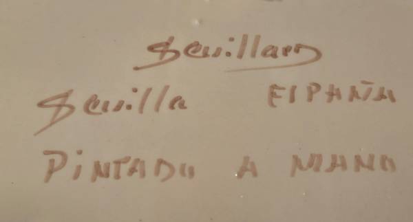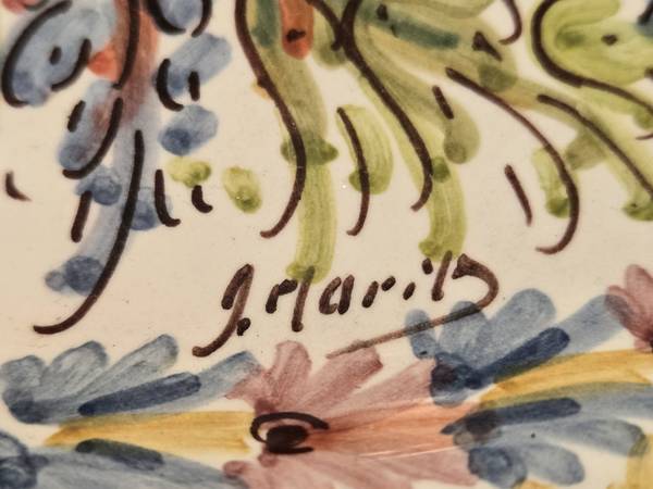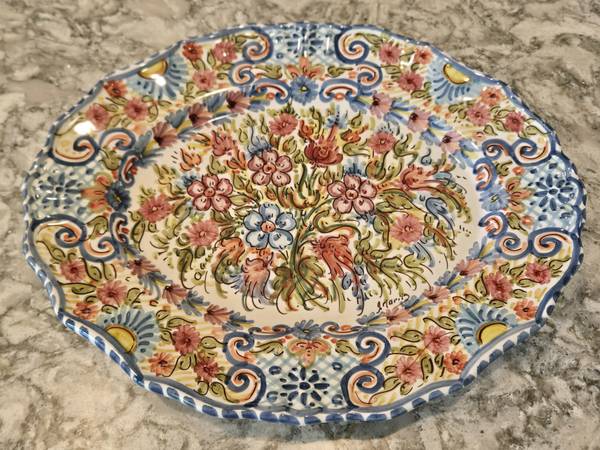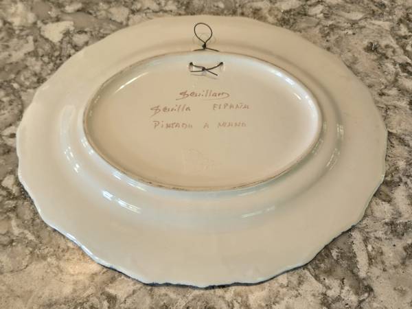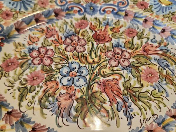 Made in Spain in the mid-20th Century, this stunning hand painted ceramic oval bowl was made in Spain. It is signed by the artist, and marked on the back. A unique, hanging system is built into the original art piece. This has never been used, it has been on display in a case for over 60 years. So precious and pretty! Can also ship with added on cost.