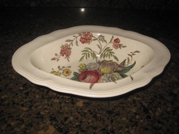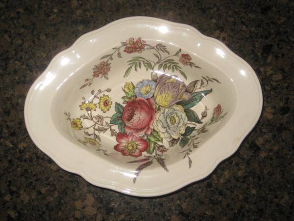 Oval serving bowl. Great Britain. A few tiny nondetracting chips. 9 1/2" long and 7" wide. Floral pattern. CASH ONLY, You pick up. FCFS. Serious inquiries only. Thanks.