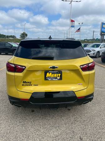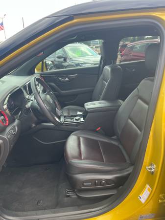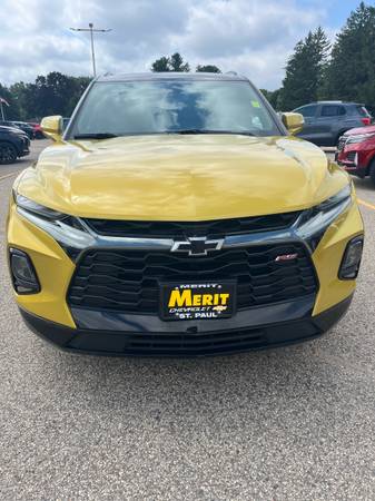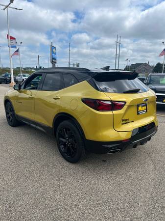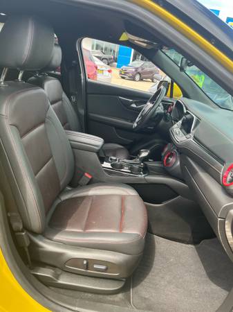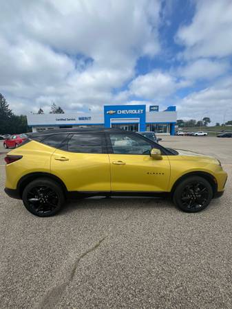 AWD. CARFAX One-Owner. Nitro Yellow Metallic 2022 Chevrolet Blazer RS AWD 9-Speed Automatic with Overdrive 3.6L V6 SIDIEnhanced Convenience Package (Heated Rear Outboard Seating Positions, Memory Settings For Driver Seat & Exterior Mirrors, Power Tilt & Telescoping Steering Column, and Ventilated Driver & Front Passenger Seats), Preferred Equipment Group 1RS (Heated Driver & Front Passenger Seats and Heated Steering Wheel), AWD, 3.49 Final Drive Axle Ratio, 4-Wheel Disc Brakes, 6 Speakers, 6-Speaker Audio System Feature, 6-Way Power Front Passenger Seat Adjuster, ABS brakes, Air Conditioning, Alloy wheels, AM/FM radio: SiriusXM with 360L, Apple CarPlay/Android Auto, Auto High-beam Headlights, Auto-dimming door mirrors, Auto-dimming Rear-View mirror, Automatic temperature control, Black 2-Tone Roof, Brake assist, Bumpers: body-color, Child-Seat-Sensing Airbag, Compass, Delay-off headlights, Driver door bin, Driver vanity mirror, Dual front impact airbags, Dual front side impact airbags, Electronic Stability Control, Emergency communication system: OnStar and Chevrolet connected services capable, Exterior Parking Camera Rear, Four wheel independent suspension, Front anti-roll bar, Front Bucket Seats, Front Center Armrest, Front dual zone A/C, Front reading lights, Fully automatic headlights, Garage door transmitter, Heated door mirrors, Heated front seats, Heated steering wheel, High-Intensity Discharge Headlights, Illuminated entry, Knee airbag, Leather Shift Knob, Low tire pressure warning, Navigation System, Not Equipped w/Driver & Fr Passenger Heated Seats, Not Equipped w/Heated Rear Outboard Seats, Not Equipped w/Heated Steering Wheel, Not Equipped w/Rear Park Assist, Occupant sensing airbag, Outside temperature display, Overhead airbag, Overhead console, Panic alarm, Passenger door bin, Passenger vanity mirror, Perforated Leather-Appointed Seat Trim, Power door mirrors, Power driver seat, Power Liftgate, Power passenger seat, Power steering, Power windows, Radio data system, Radio: Chevrolet Infotainment 3 Plus System, Rear anti-roll bar, Rear reading lights, Rear seat center armrest, Rear window defroster, Rear window wiper, Remote keyless entry, Ride & Handling Suspension, Security system, SiriusXM w/360L, Speed control, Speed-sensing steering, Split folding rear seat, Spoiler, Steering wheel mounted audio controls, Tachometer, Telescoping steering wheel, Tilt steering wheel, Traction control, Trip computer, Turn signal indicator mirrors