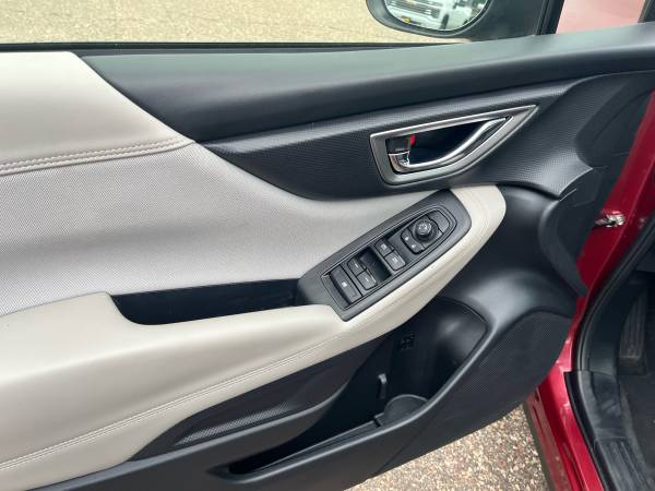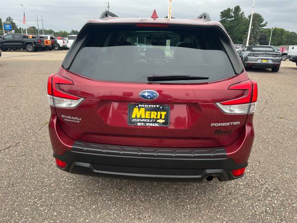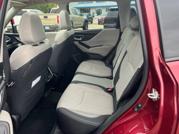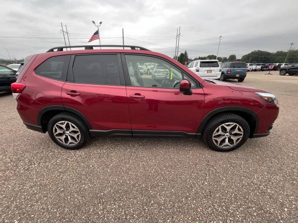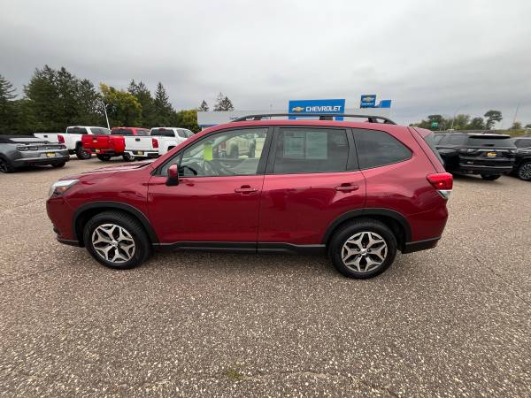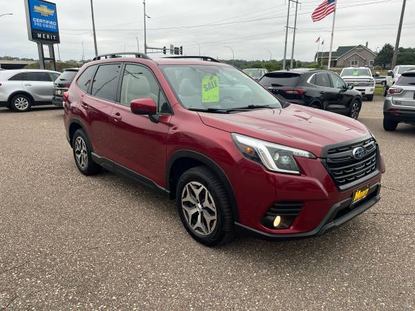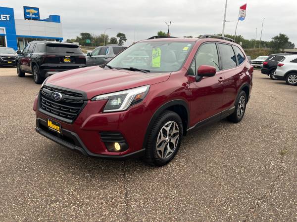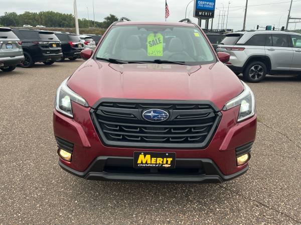 CARFAX One-Owner. Crimson Red Pearl 2023 Subaru Forester Premium AWD Lineartronic CVT 2.5L 4-Cylinder DOHC 16VBlind Spot Detection w/RCTA & Power Rear Gate (Blind-Spot Detection (BSD), Driver's Seatback Divided Pocket, Dual USB Charge Ports, EyeSight System, Multi-Function High Grade Display, and Power Rear Gate), 3.70 Axle Ratio, 4-Wheel Disc Brakes, 6 Speakers, ABS brakes, Air Conditioning, Alloy wheels, AM/FM radio: SiriusXM, Anti-whiplash front head restraints, Auto High-beam Headlights, Auto-Dimming Mirror w/Compass & HomeLink, Automatic temperature control, Brake assist, Bumpers: body-color, CD player, Driver door bin, Driver vanity mirror, Dual front impact airbags, Dual front side impact airbags, Electronic Stability Control, Emergency communication system: STARLINK Safety and Security (Subscription Required), Exterior Parking Camera Rear, Four wheel independent suspension, Front anti-roll bar, Front Bucket Seats, Front Center Armrest, Front fog lights, Front reading lights, Fully automatic headlights, Heated door mirrors, Heated Front Bucket Seats, Heated front seats, Illuminated entry, Knee airbag, Low tire pressure warning, Occupant sensing airbag, Outside temperature display, Overhead airbag, Overhead console, Panic alarm, Passenger door bin, Passenger vanity mirror, Power door mirrors, Power driver seat, Power moonroof: Panoramic, Power steering, Power windows, Premium Cloth Upholstery, Radio data system, Radio: Subaru Starlink 6.5" Multimedia Plus System, Rear anti-roll bar, Rear Bumper Cover, Rear seat center armrest, Rear window defroster, Rear window wiper, Remote keyless entry, Roof rack: rails only, Security system, Speed control, Speed-sensing steering, Split folding rear seat, Spoiler, STARLINK/Apple CarPlay/Android Auto, Steering wheel mounted audio controls
