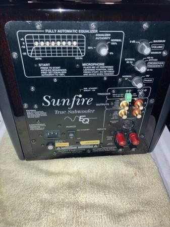 Sunfire TS-EQ10 True Subwoofer EQ 10 Signature Dark Rosewood in excellent condition and perfect working order. Comes with a power cord, and calibration microphone (Microphone stem has been repaired but does not effect function) for an extra $100 if needed or wanted.. This gets down to 18hz and gets loud. Comes in the much desired dark rosewood veneer with high gloss, EQ function makes it simple to fine tune it to your room with the included microphone. This simply put larger subs to shame on both output and low end. I recently 2025 had the amp plate professionally rebuilt. I shipped it to 1 of the few specialist that are qualified to repair the amps. 3 months it was gone and $400 with shipping. The amp should last at least 10 more years on 24 x 7 days per week. Price is FIRM, no offers or trades. The driver picture has a weird shadow that looks like there is a gap in te surround. Just a shadow.
