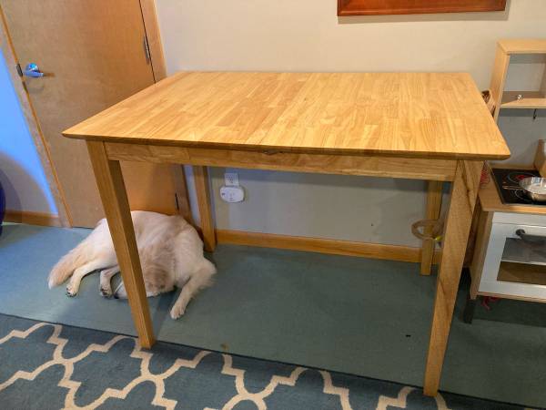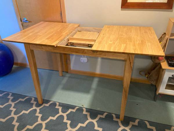High top table. Counter height. Has a built-in leaf to expand table. 48”x32” or 60” x 32”