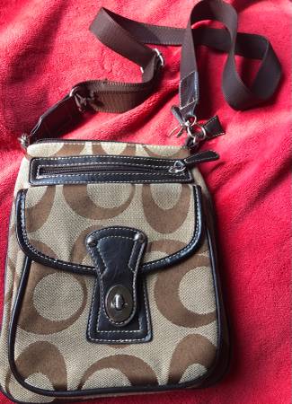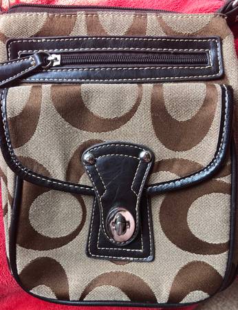 Coach crossbody tan/brown bag Leather accents on buckle and strap and around zipper Pocket front storage Zipper pocket inside Zipper pocket front and back outside Small Pouch inside
