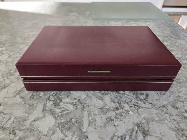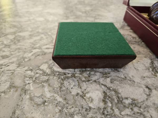 The gavel and block are solid walnut, and perfect condition. The decorative gift boxes faux leather and has a latch, and is lined with a bright gold fabric. The block has a felt bottom.