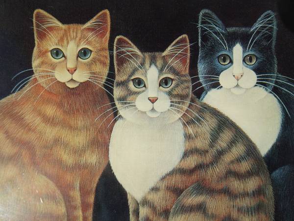 Group of three (3) cats, kitties – Orange Ginger Tabby, Brown Black Tabby with White face and chest, Black Tuxedo cat with white face and chest. Kitty Cat cover art.