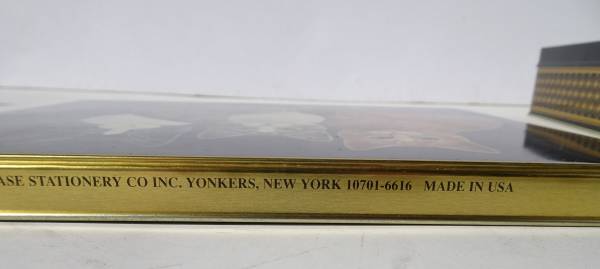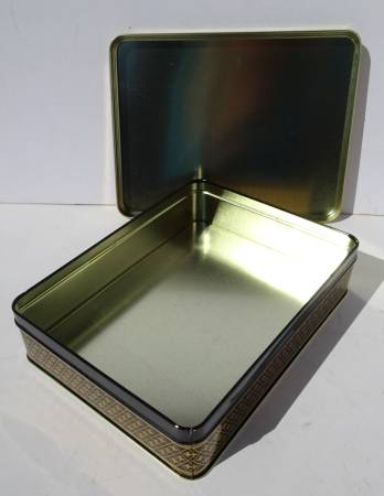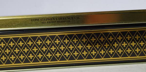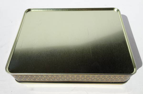 Brass / bronze metal finish on box tin edges with gold plus symbols on black background.
