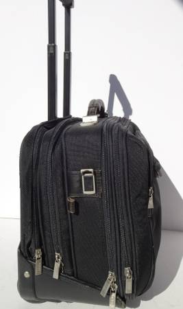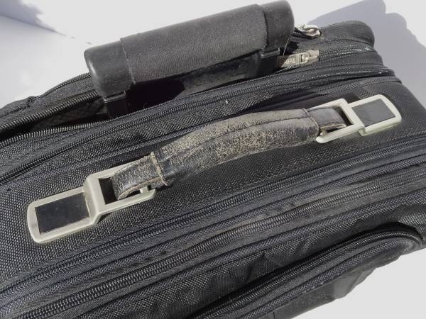 Features: Heavy Duty Material, Thick comfortable leather handle, Hidden extendable pull handle, Adjustable Straps, Expandable, Laptop Compartment, Retractable Handle, Wheels/Rolling