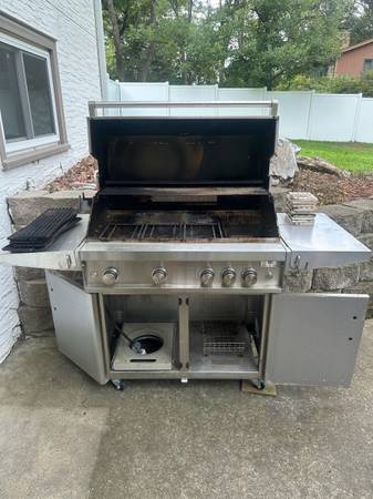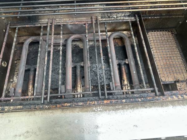 Has 3 main burners, a sear station and a rear burner that all work. Also comes with a working rotisserie. Cleans up pretty nice but does show its age. Almost all the ceramic bricks have been replaced and you get one brand new spare still in the box. Igniters don’t work but you get a handheld one with purchase. Temp gauge works.