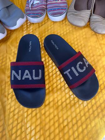 The Nautica Sandals could also be worn by a man or woman. They are navy blue with red and white stitching. They say size 10 on the bottom. I assume this is womans, and a man's size 8,