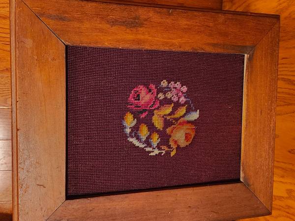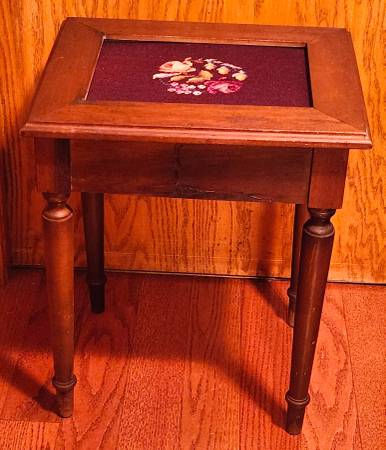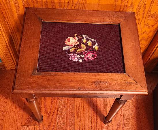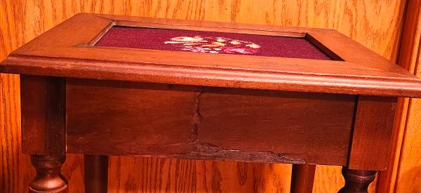 Sweet little wood storage table cabinet. The needlepoint art in the lid can be changed out to something else. It has repaired damage to the front panel as shown in the photos. It's not very noticeable when the lid is closed. Three nice storage compartments, very clean. Listed as good for the repair. The rest of the piece is in great condition. Charming look.