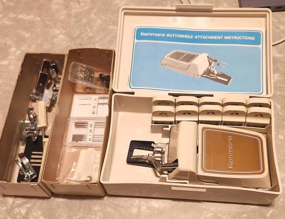 Vintage Sears Kenmore Buttonhole Attachment 6736 w Manual 42231 plus box of tools and feet. In original case and box sleeve. Excellent condition.