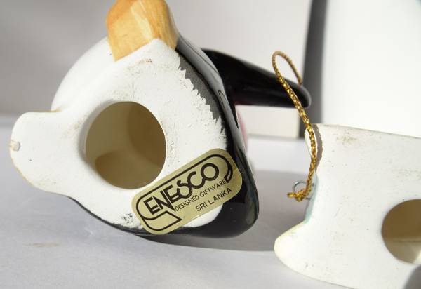 Vintage Enesco Ceramic Penguin pulling Baby Penguin on Sled Figurine with Winter Hats No cracks. Shows some light handling. Cord is solid. One small chip on back of hat. Item Height 3 1/2 in Item...
