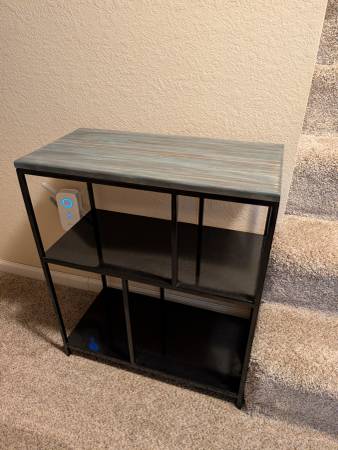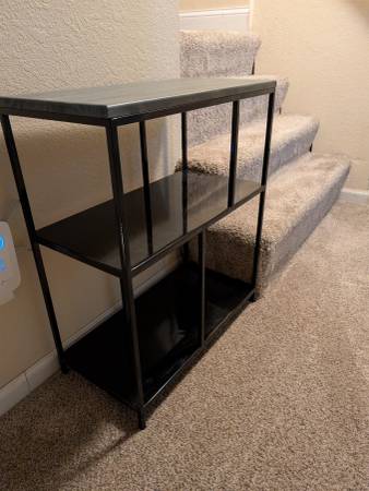 Black steel shelf with blue wood top, 12x24x29. Shelf, console table, end table, nightstand.