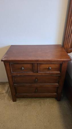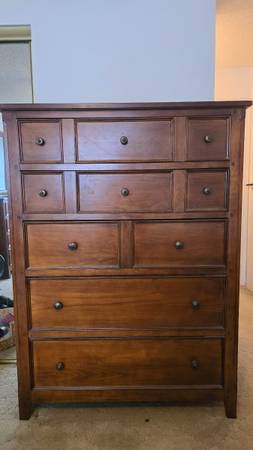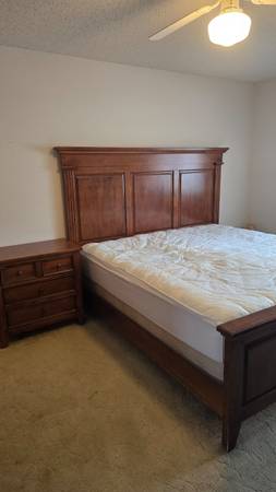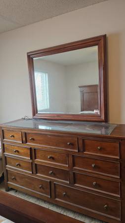 BEDROOM SET. Includes king size bed, dresser with mirror, tall chest of drawers and night stand. Solid wood and good quality furniture but has wear. Minor scratches.