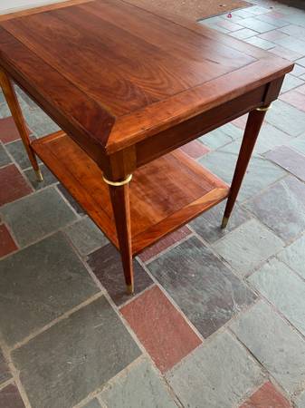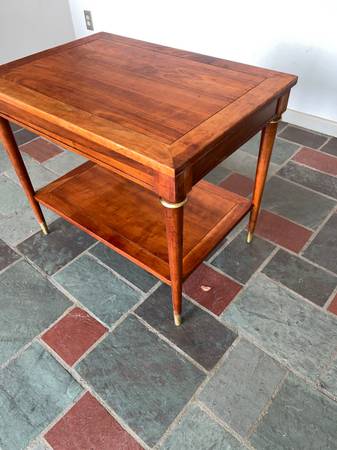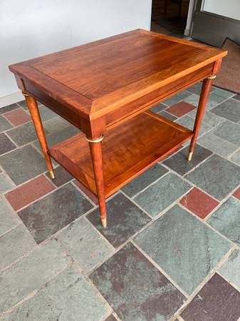 Brandt cherry end table with brass trim sturdy - refinished with clear polyurethane . 28” by 19.5” and 23” tall. Brandt brass name plate in the underside. $99 - cash only please.