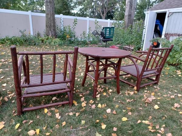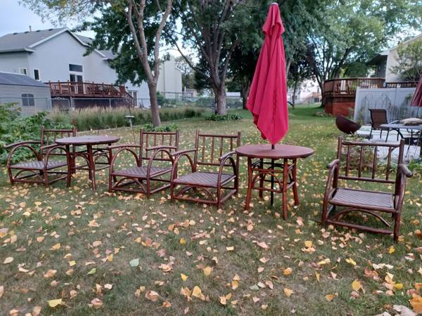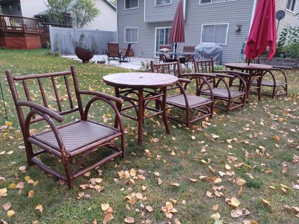Here we have a big set of Old hickory from Shelbyville Indiana porch furniture. I have four big heavy lounge chairs, two tables and umbrella. All the weave is in perfect no cushions. There are some cosmetic issues here and there. A couple chairs have some bark missing and two screws have come apart one a curved piece of wood under the seat and one chair has a crack on the front leg which looks like it can be fixed. This is very heavy furniture. One price for all or I will split up. There are a couple shrinkage cracks in the wood on a couple chairs but everything is still solid. Tables are in very good condition. Chairs are 36"H x 26"x26" tables are 36"dia x 30"High