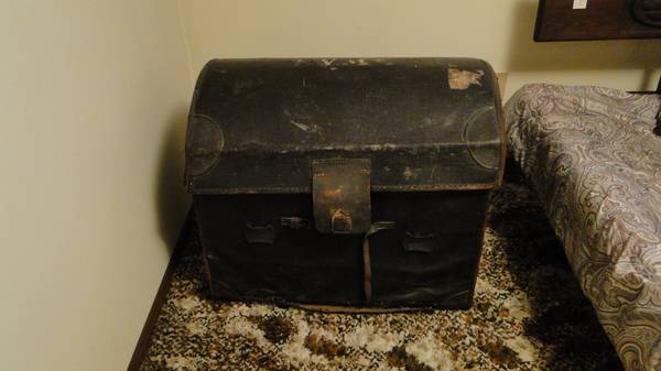 this is a interesting piece of furniture. A old leather trunk lined with wicker (mint condition). Leather handles. Leather flap in front. On top is some of the letters of name of owner. 25" tall when closed x 30 1/2" long x 21" deep. Price firm - cash only.