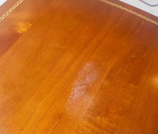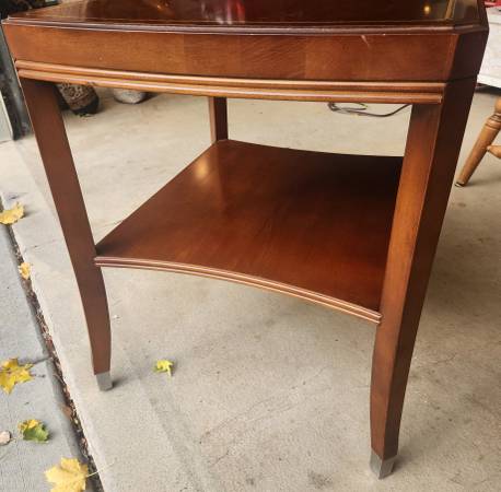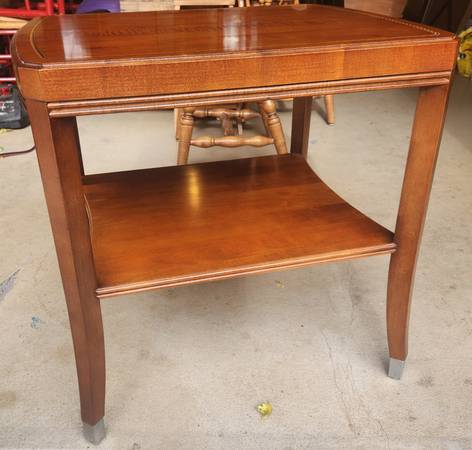Great look. Nice quality table accented with inlaid geometric design. 27" x 22" x 26.5" tall. Lower shelf has 11' height clearance. Metal leg caps. Has an area of whitish stain on the top as shown...