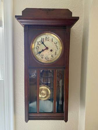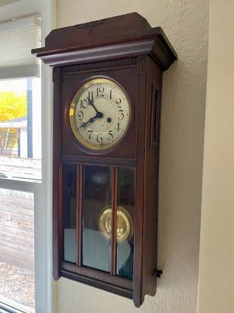 Very old clock in working condition. Has a chime, which is currently dampened with a cloth. Includes key. Don’t know much about its history.