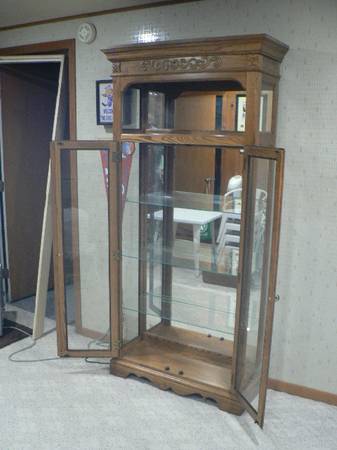 I'm selling a gorgeous, Solid Oak, lighted, curio cabinet, in excellent/like new condition, for only $100.00 or best offer, and I can deliver it if needed. Unfortunately, the photos are a bit washed out, as it's a must see/must have in person! It comes from a smoke/pet free home, measures: 38" wide X 14 1/2" deep X 78" high, has a 15" high, open area, up top, and 3 adjustable, glass shelves, with engraved plate rails, behind 2 latching glass doors. It also has beautiful Oak accents on the top front!