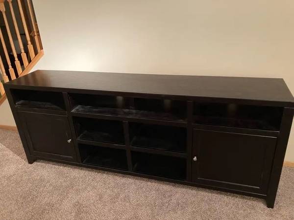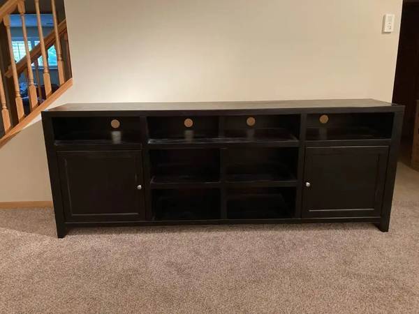 Like new cabinet, black stain 84” long x 33” high x 17” deep. Solid piece of wood furniture. Can accommodate electronics but also great for display and storage.