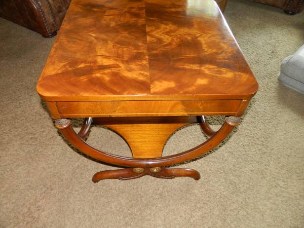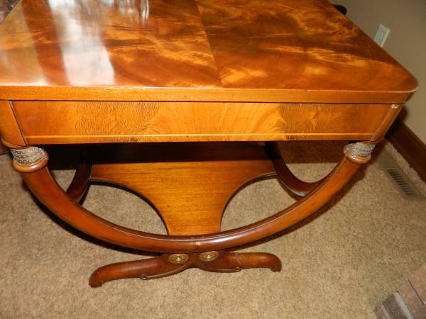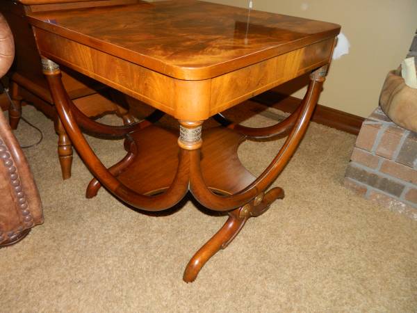 Antique Burl Walnut End Two Tier Table with Bent Wood Legs for $125. Measures approximately 24 3/8 inches by 24 3/8 inches by 24 3/8 inches. If interested, text or email.