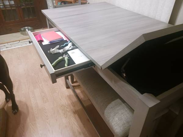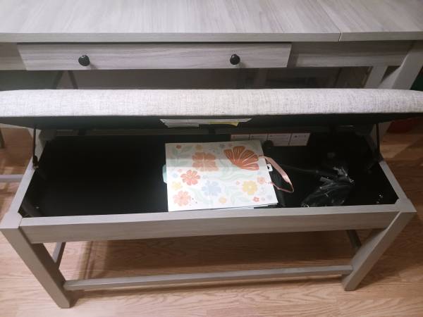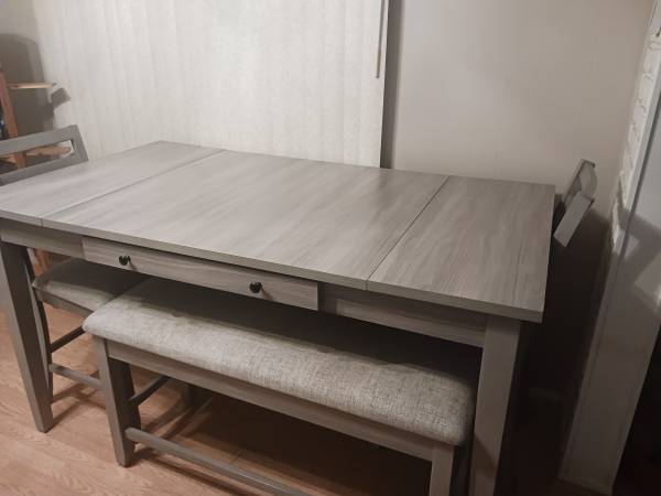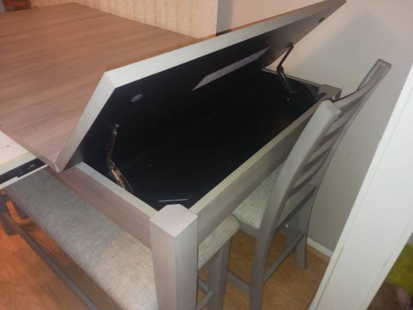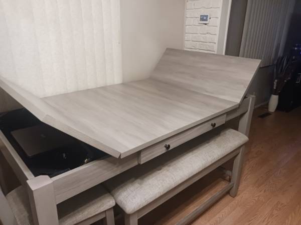 Dining table with 4 chairs and a bench. Lots of storage. There is a drawer in the table and both sides lift up for more storage space. The bench top also lifts for storage.