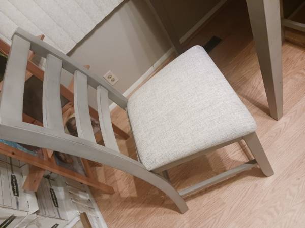 Grey distressed wood table. Chairs and bench have fabric seats Table is very heavy.