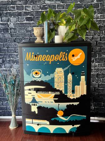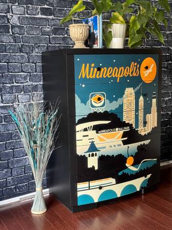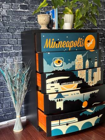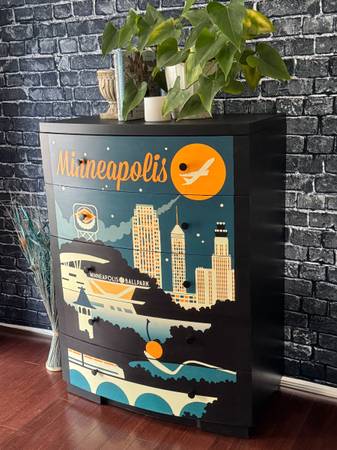 Fantastic and unique, curved front 5 drawer dresser. Freshly refinished in black with a cool Minneapolis poster applied to the fronts, all sealed with a matte topcoat. Drawers are all wood, dovetailed construction and all slide nicely. It would make a great statement piece!