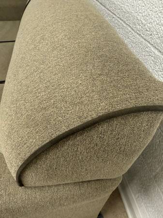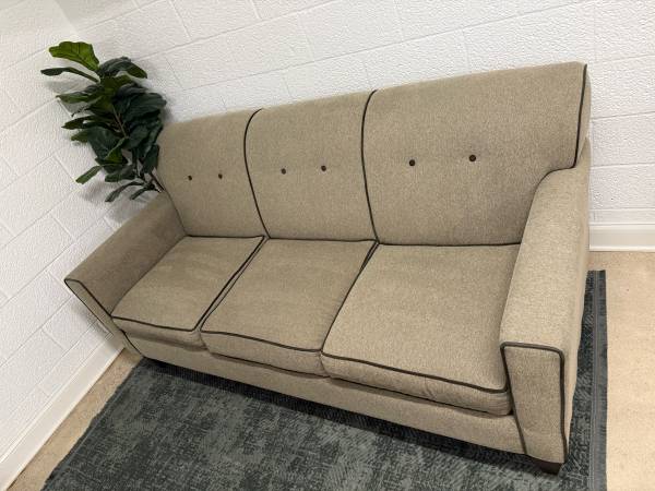 Nice gray couch by “Marshfields Furniture”. Accented with slate gray piping and buttons. Unique, bottom cushions also removable. Square/tapered walnut legs; wood. **78x35x36** -great condition...