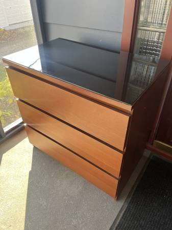 Ikea chest of three dresser drawers in dark cherry woodgrain veneer. Unit fully assembled in nice shape. Includes smoked black glass top. Great match for other IKEA bedroom furniture including Lack, Expedit, Kallax, and more.
