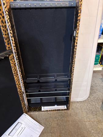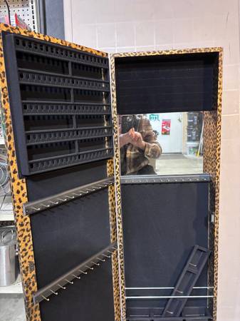 Mirrotek armoire with full length mirror with etching and leopard trim around mirror. Never been used. 100.00 cash only.